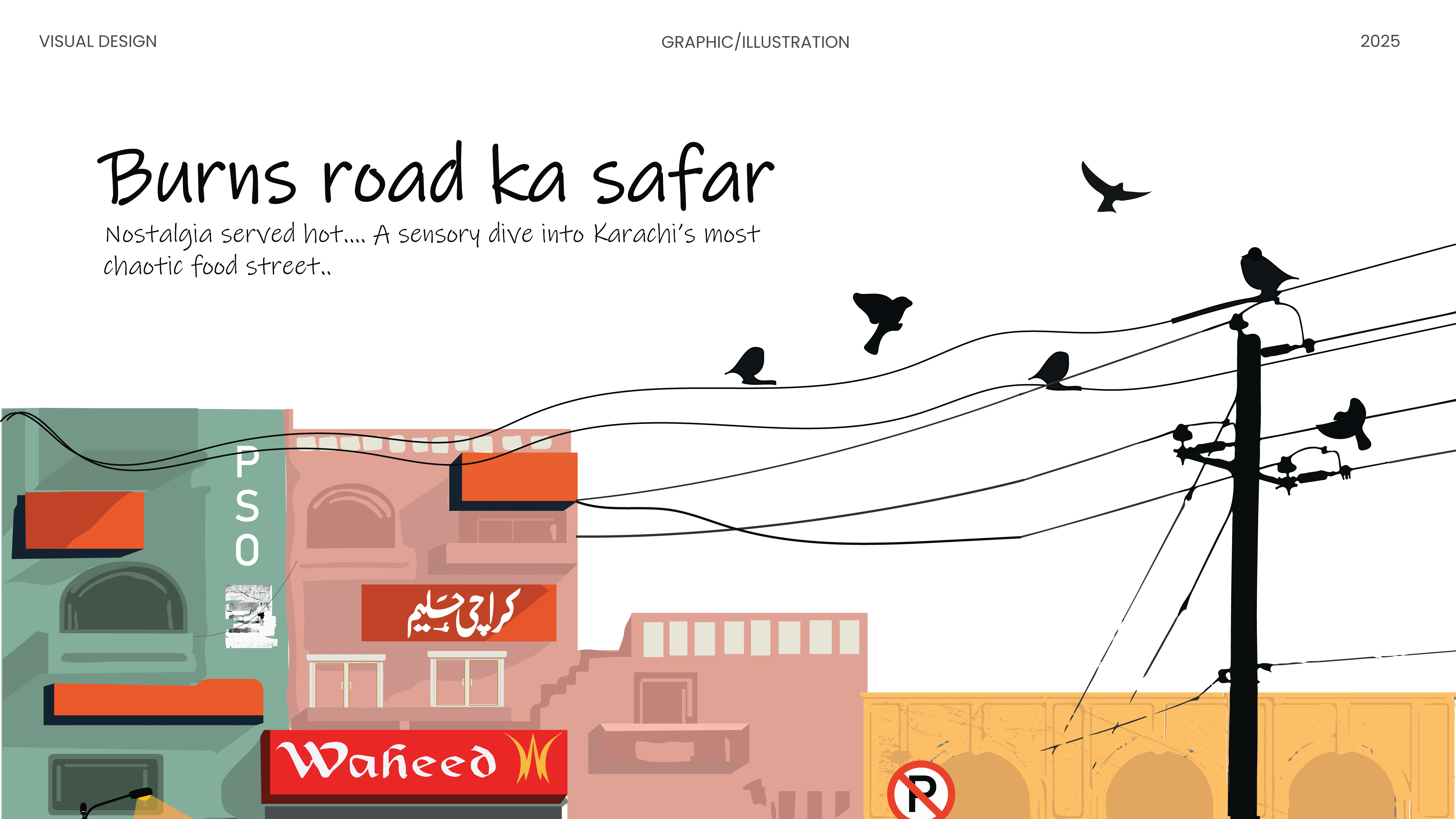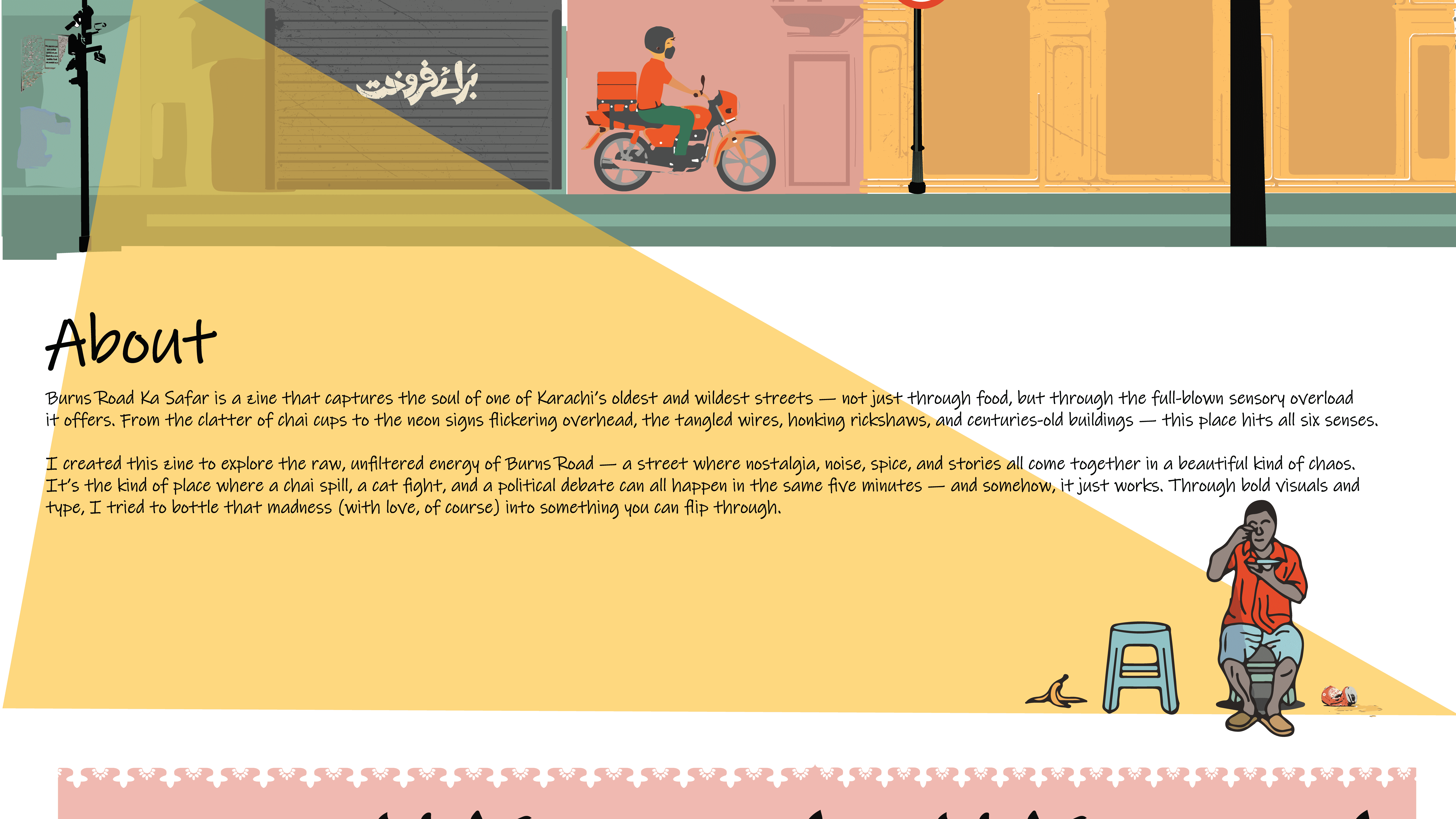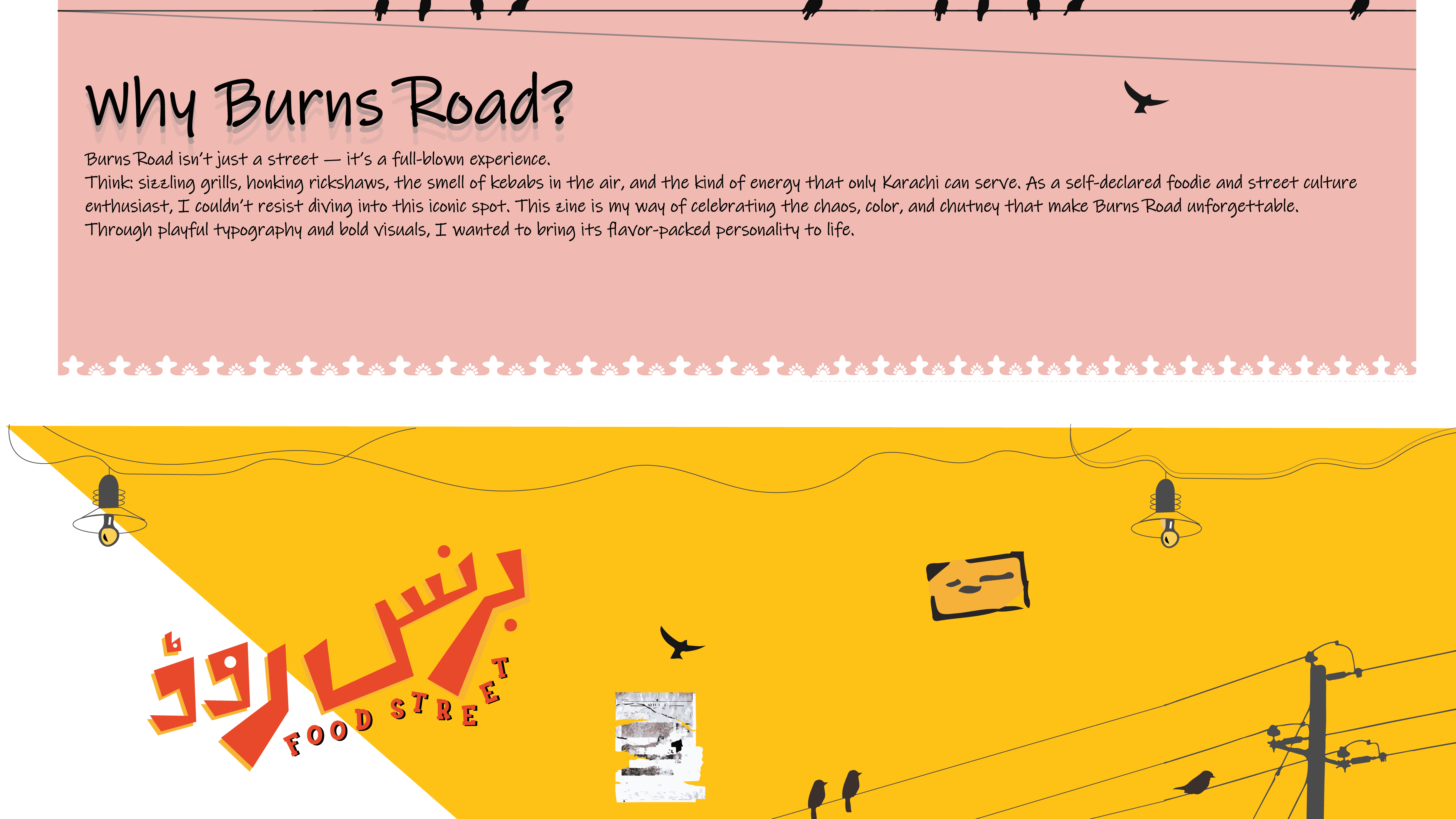 This zine is my way of expressing love for Karachi’s most iconic desi food street, Burns Road. Through a mix of experimental typography and illustrative elements, I tried to capture the mundane details that often go unnoticed, the signboards, lively food stalls, and, street chatter that truly brings Burns Road to life. This zine celebrates exactly that essence.