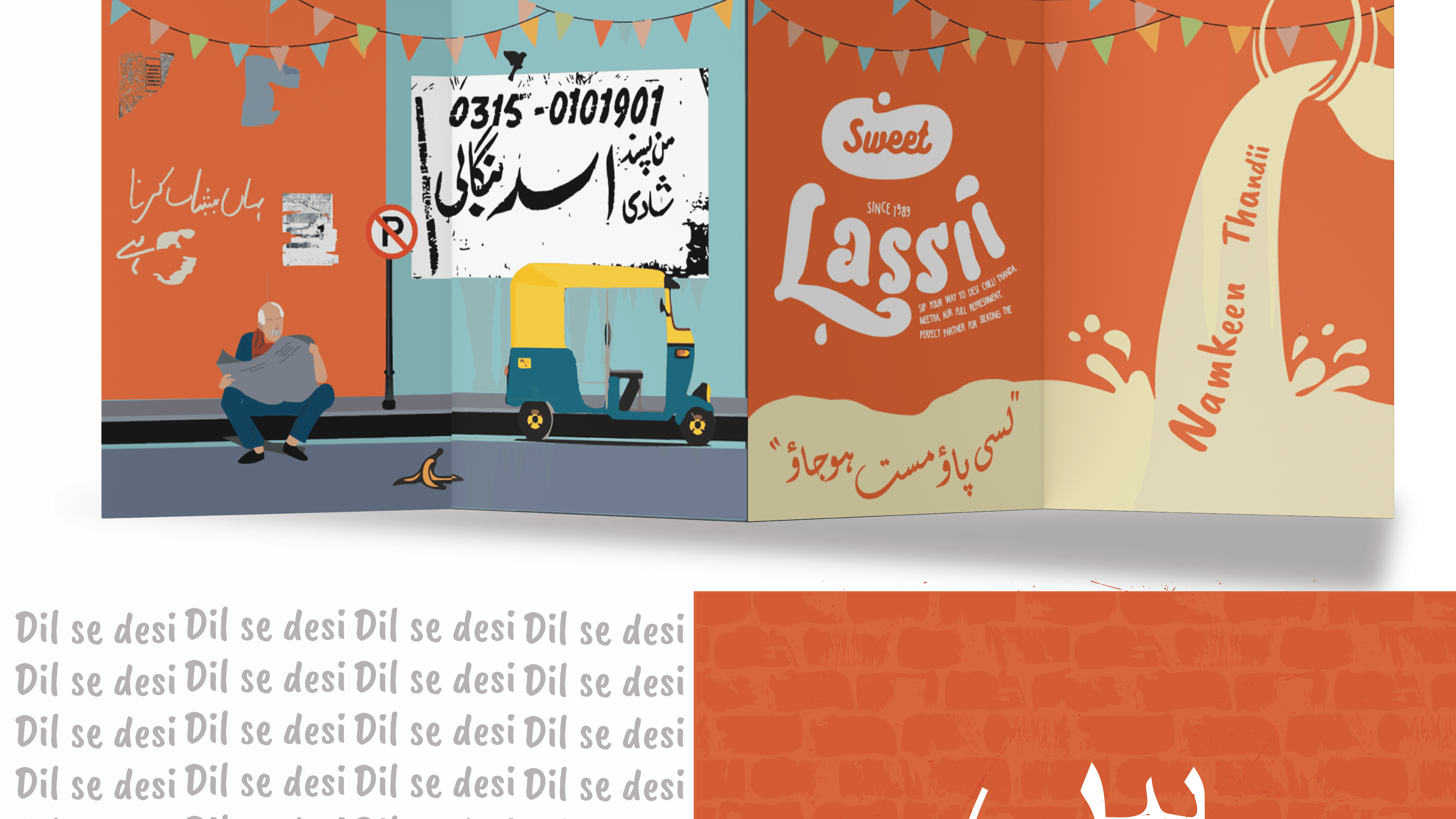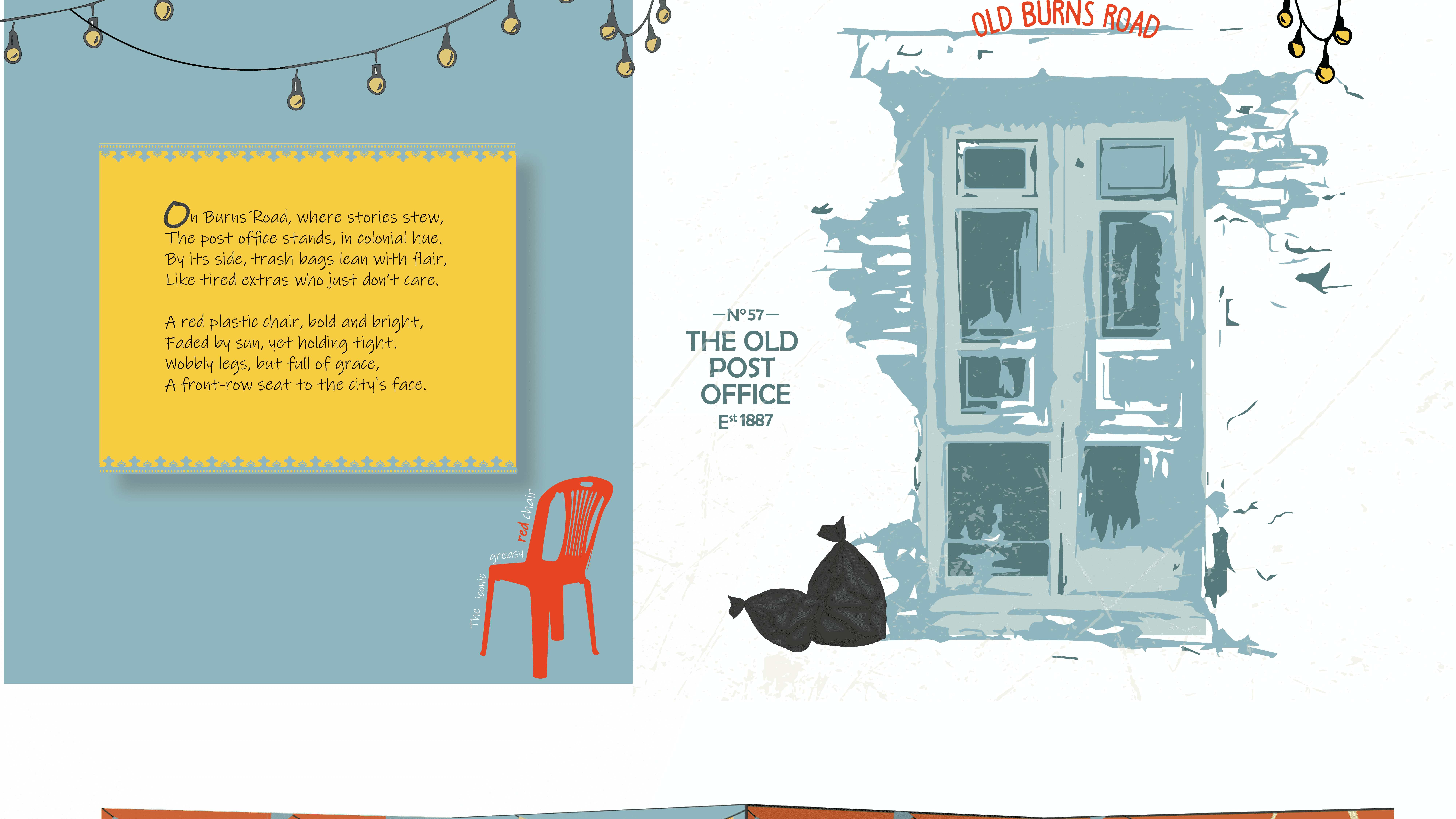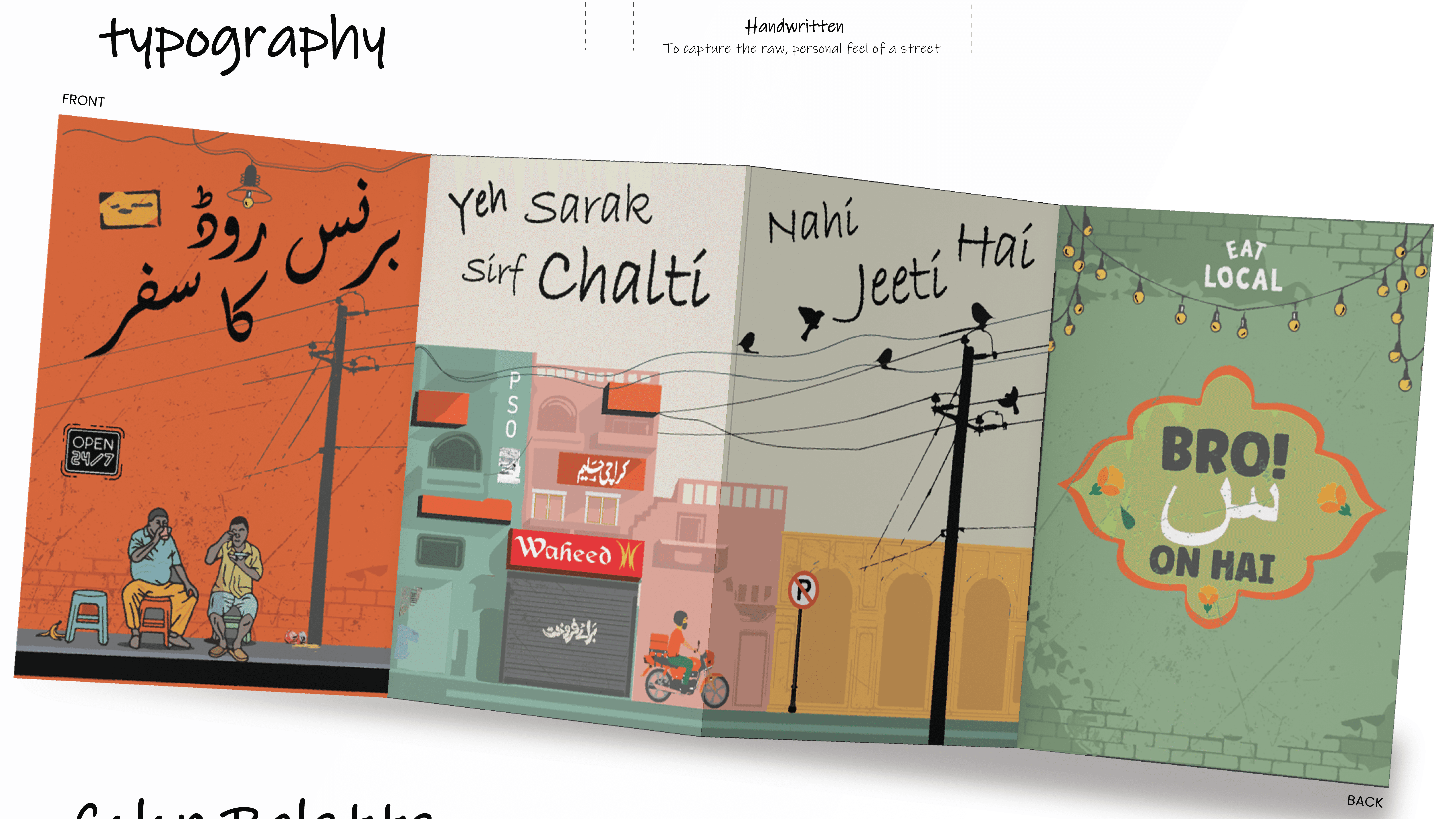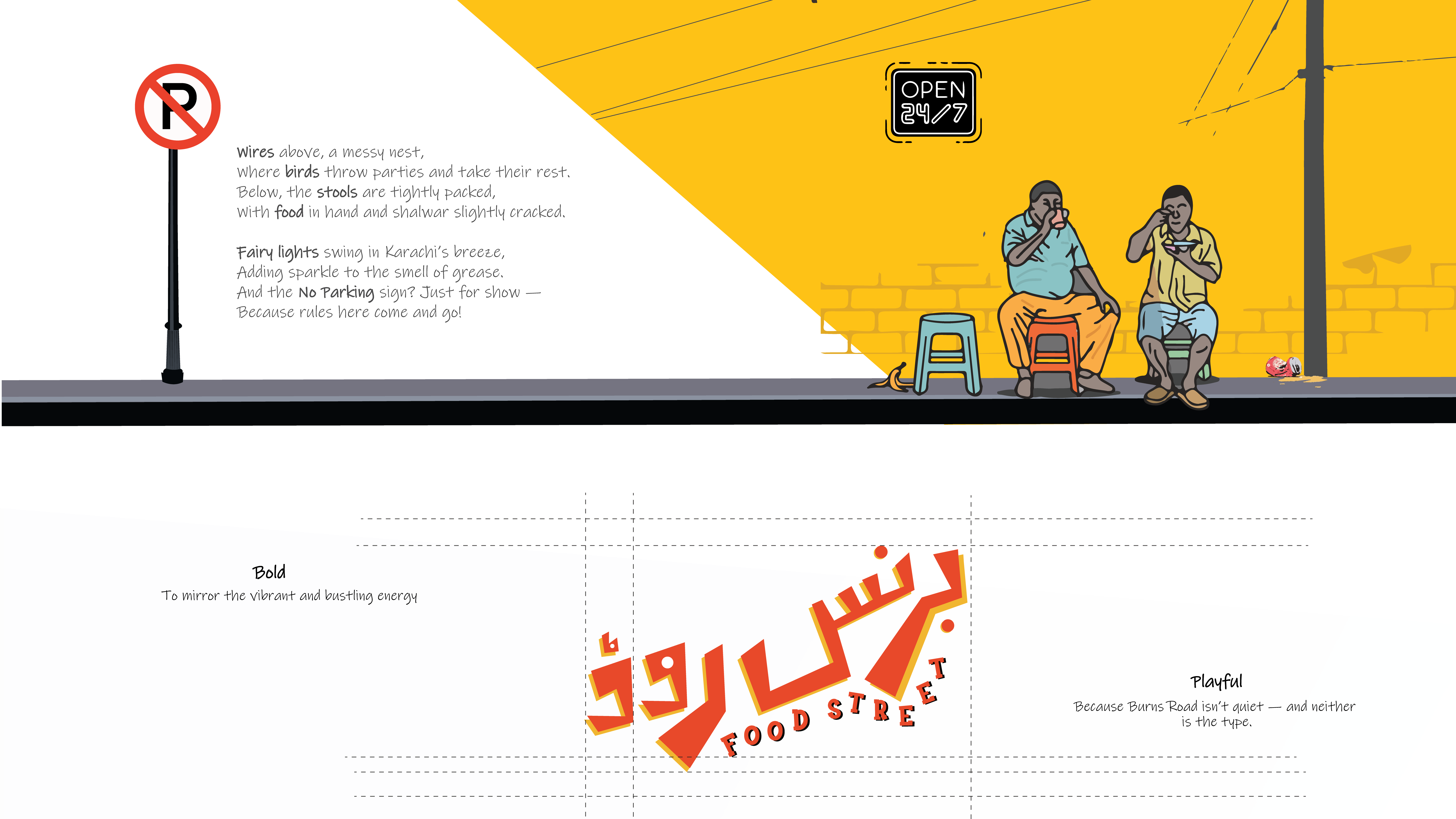 This zine is my way of expressing love for Karachi’s most iconic desi food street, Burns Road. Through a mix of experimental typography and illustrative elements, I tried to capture the mundane details that often go unnoticed, the signboards, lively food stalls, and, street chatter that truly brings Burns Road to life. This zine celebrates exactly that essence.